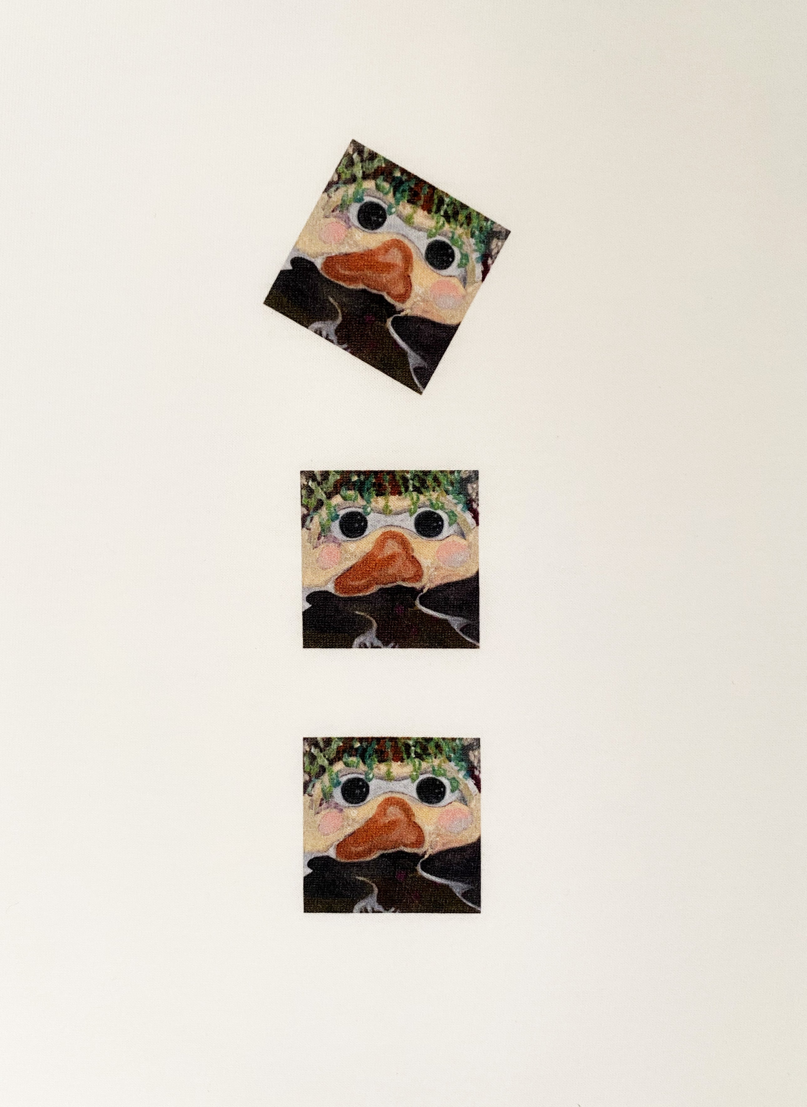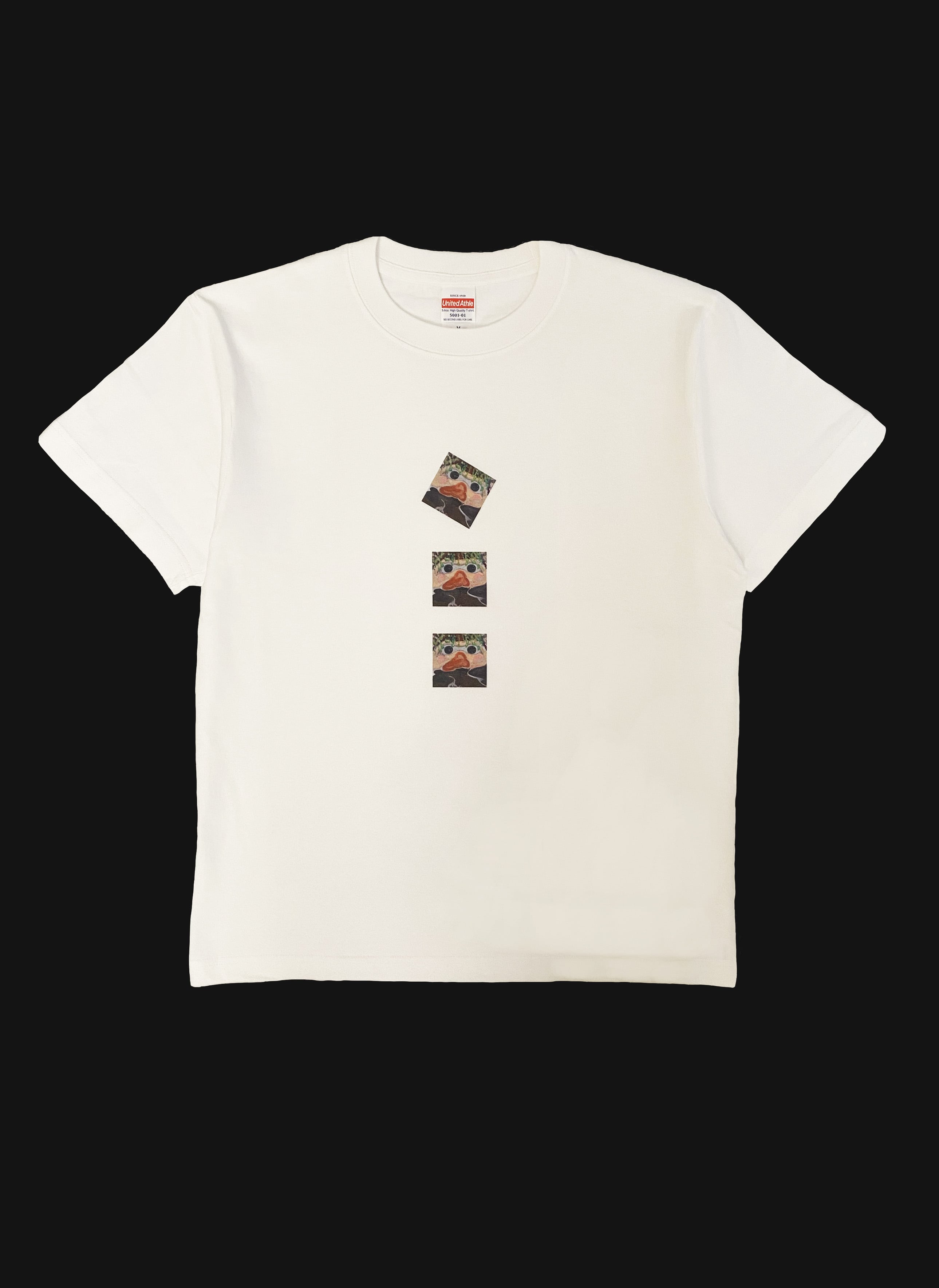 MERUのプリントが縦に3つ並んだホワイトTシャツ。